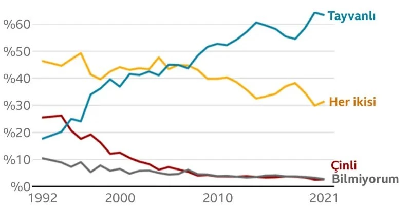 Tayvan’ı kendi topraklarının bir parçası olarak gören Çin, “Tek ülke, iki sistem” olarak adlandırılan seçeneği masaya sunarken Tayvan’ın kendi yönetimine bağlanması halinde büyük oranda özerk olmasına izin vereceğini belirtti. Bu sistem 1997 yılında Hong Kong’un da Çin yönetimine bağlanmasının önünü açarken kendini bağımsız bir devlet olarak gören Tayvan bu teklifi reddetti. Buna karşın Pekin, Tayvan’ın gayr-i meşru olduğunu ileri sürdü. Son yıllarda Çin-Tayvan ilişkileri oldukça gergin bir hal alırken Çin, Tayvan’ın bağımsızlık girişimlerine karşı sert bir tutum sergiliyor ve askeri tatbikatlar düzenleyerek adaya gözdağı veriyor. Diğer taraftan Tayvan ise demokratik yapısını koruyarak uluslararası alanda daha fazla tanınma çabası içindedir. Aşağıdaki tabloda da Tayvan’da kendisini Tayvanlı olarak tanımlayanların artışta olduğunu gözlemlemekteyiz: