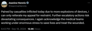 Birleşmiş Milletler Lübnan Özel Temsilcisi Jeanine Hennis’in X gönderisi, 18 Eylül 2024